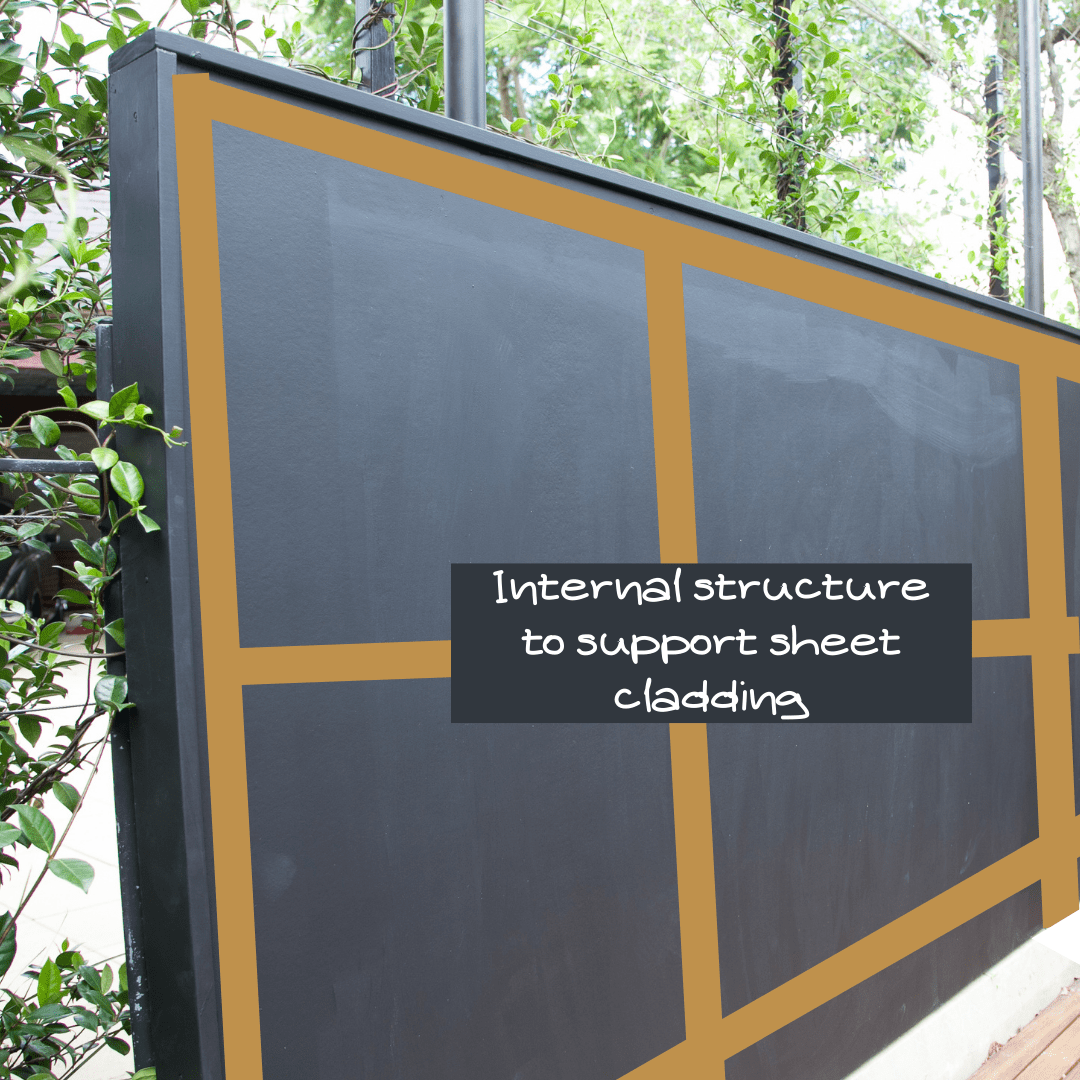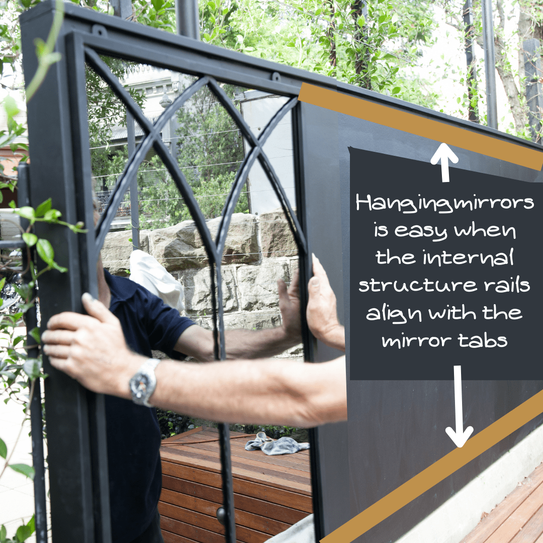 Planning allowed them to customize the wall to easily hang the mirrors. Crossbars on the wall were positioned to align with the tabs on the top and bottom of the mirrors. The frame was clad in exterior sheeting and the faces were capped so the wall looked more stylish. Painting the wall in a very dark colour helped it merge with the surrounding foliage.