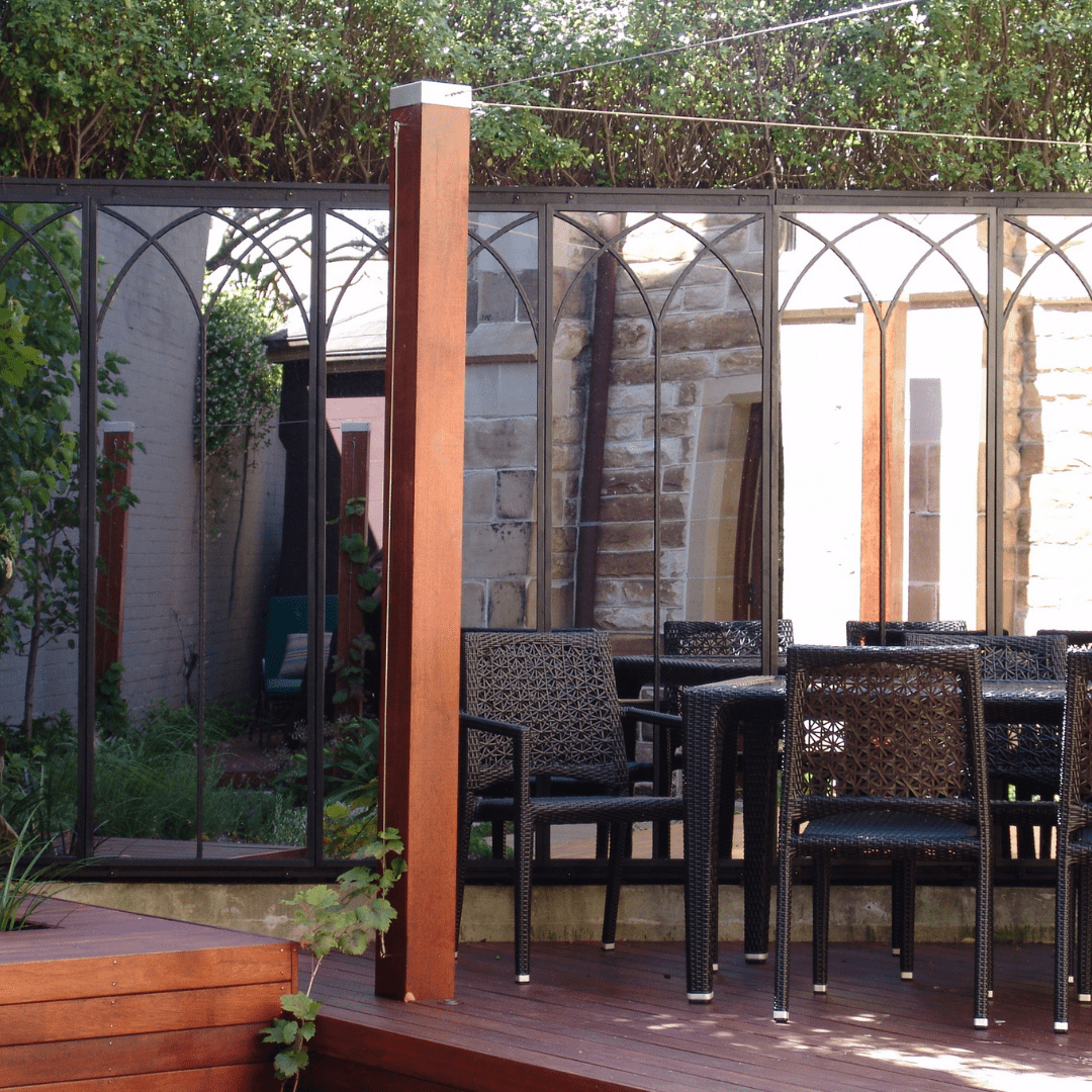 The owner of this apartment restyled a section of their boundary fence to create a privacy wall to house a set of outdoor mirrors, that would add style to their courtyard.They began by replacing an open fence with a blank-canvas style wall.