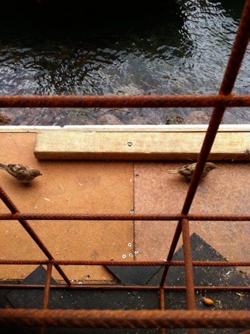 I laid bread crusts beneath an old wooden fruit box I’d propped up with a gnarly stick. Tying one end of a length of string round the stick I threaded the rest back inside through the venetian blinds.