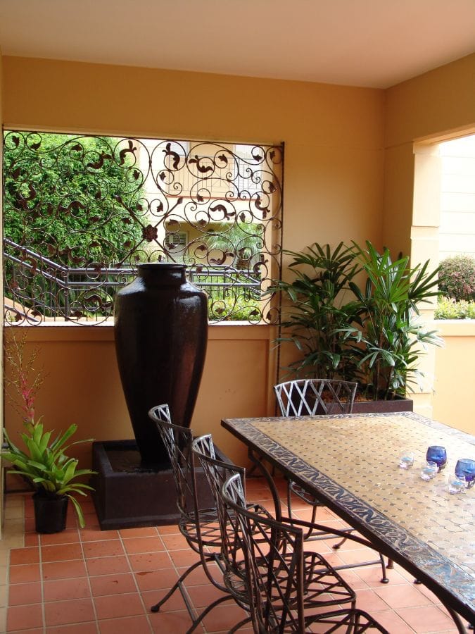 - We chose shade-loving rhapis palms for the pots and the calathea for the planter. These are easy care green life that suits the shady courtyard space making the outdoor area is easy to maintain.