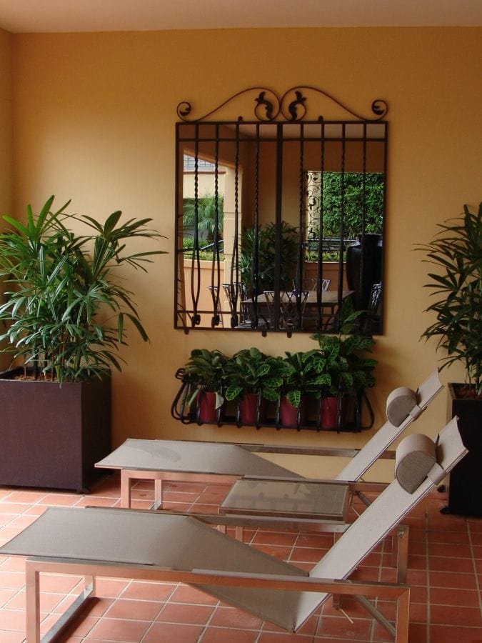- On the other side of the courtyard, we hung the bowed front mirror and matching planter. The mirror reflects the gorgeous water views from inside the apartment and the bowed front planter beneath it brings more greenery into the mix. It brings light to that area and reflects the whole courtyard, which increases the sense of space.