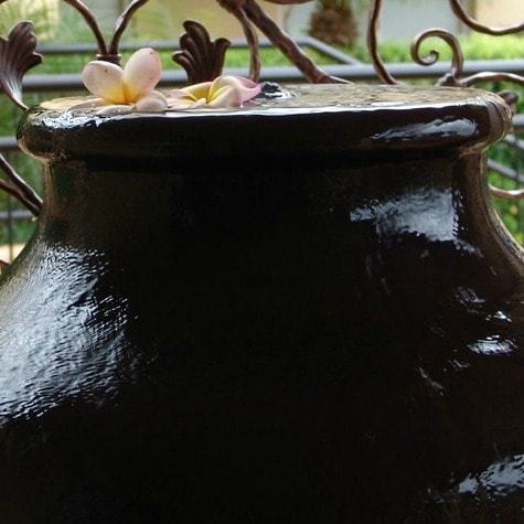 - Used a water feature in front of the trellis which added a focal point, helping build the layered look you need to get the feeling right. Fallen frangipani flowers float in the water bowl.