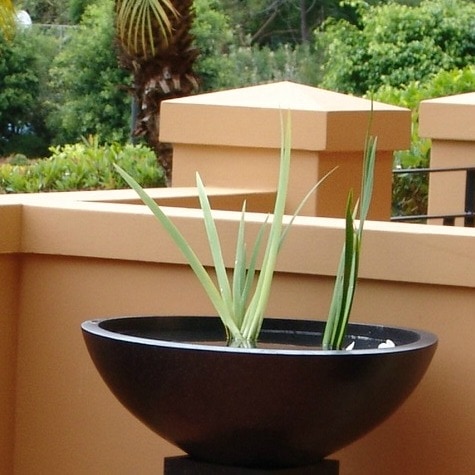 - Lightweight pots and the water feature were sourced from Pots Online to compliment the colours of the trellis and the contemporary deck chairs.