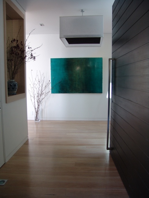 The front door was one of those beautiful larger-than-life, dark stained solid timber doors, that pivoted on a vertical hinge. With the front door opened it was obvious why the colour mattered – there on the opposite wall was a beautiful feature oil painting created with layered glazes in stunning shades of verdigris.